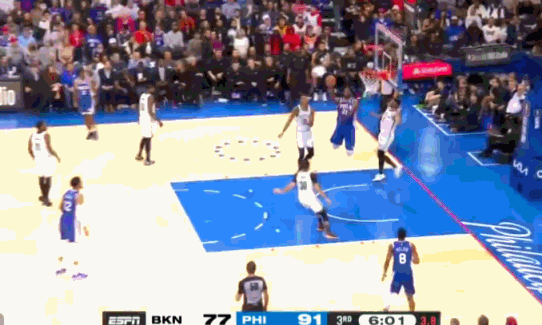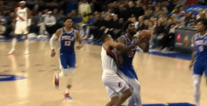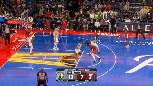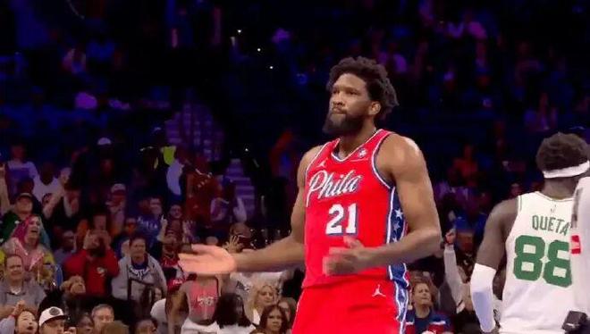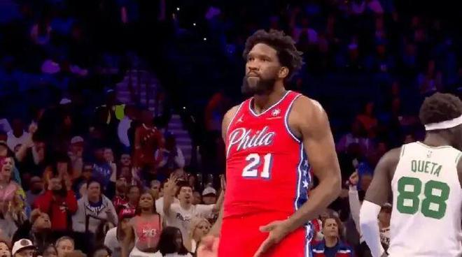 打凱爾特人,恩比德命中了一個(gè)平平無奇中距離且造成了對手犯規(guī)