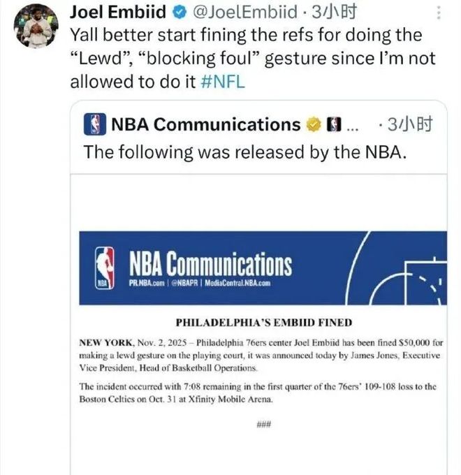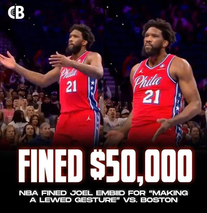 今天,NBA官方宣布, 恩比德因不雅慶祝動(dòng)作,被聯(lián)盟罰款5萬美元。