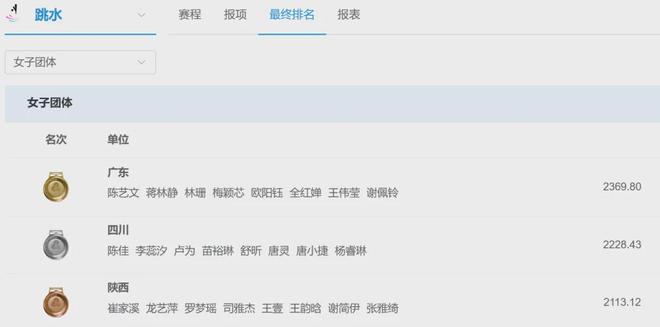 今天(11月2日)第十五屆全國運動會跳水項目在廣州開啟首個比賽日今天是跳水女子團體比賽兩位奧運冠軍陳藝文、全紅嬋壓陣的廣東隊在女團四個項目均拿下第一最終總分2369.8拿下